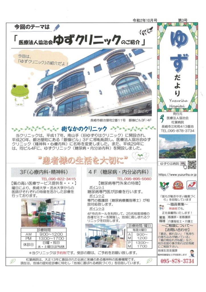今回の「ゆずだより」(第3号)は、ゆずクリニック(長崎市鍛冶屋町)3F(心療内科・精神科)
