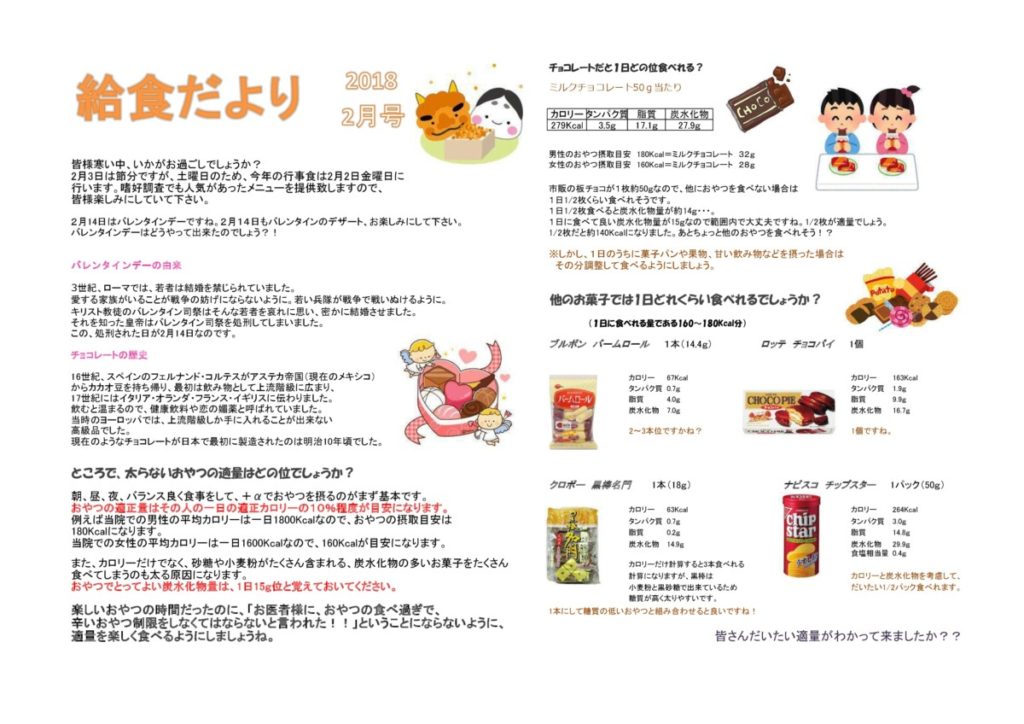 栄養課だより2月号を掲載しました。今月号では、バレンタインや「太らないおやつの適量」についての記事を掲載しています。