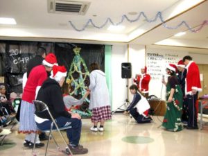 クリスマス会前半は、クリスマスの歌や合唱を中心におこなわれ、後半は、ゲームやクイズ